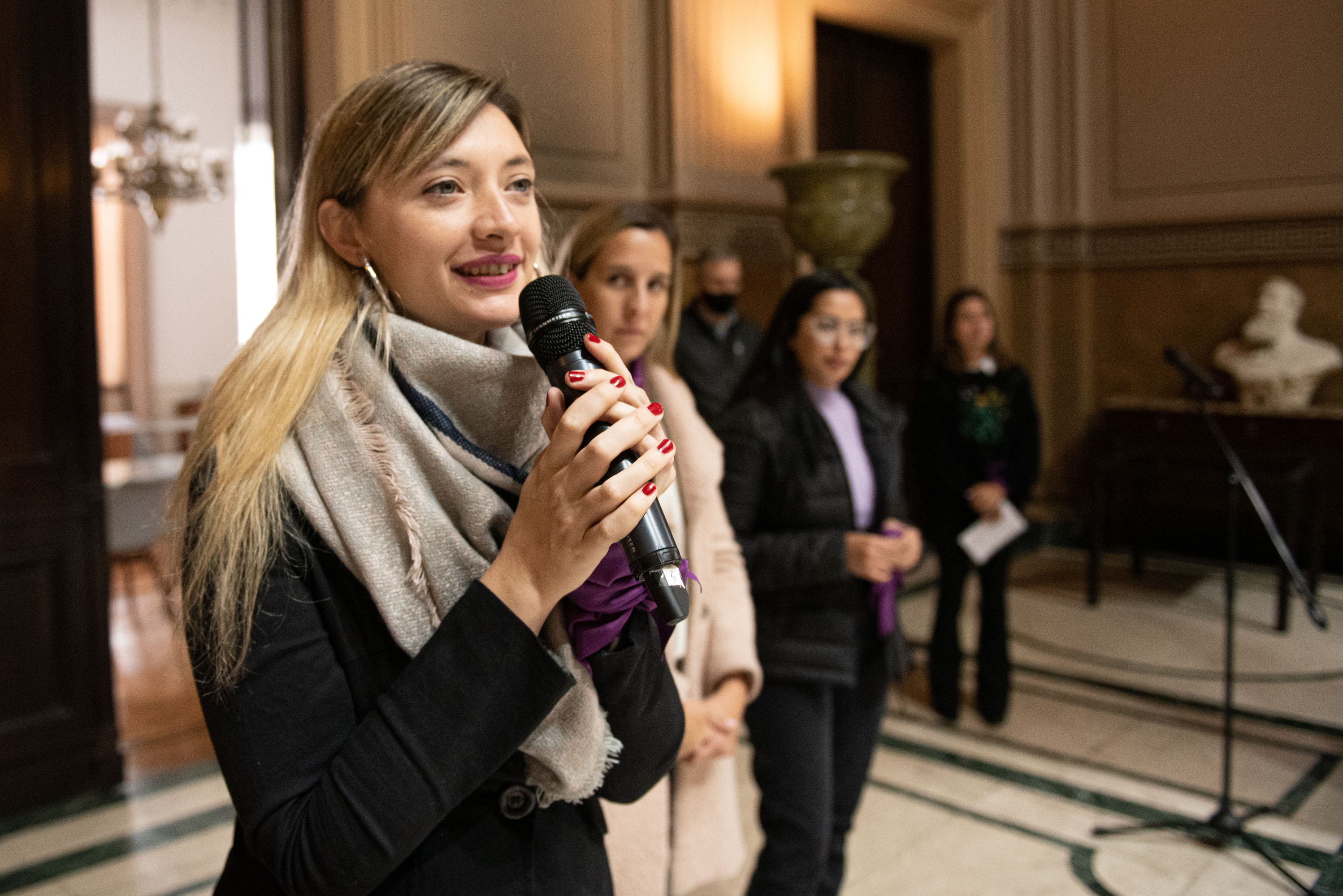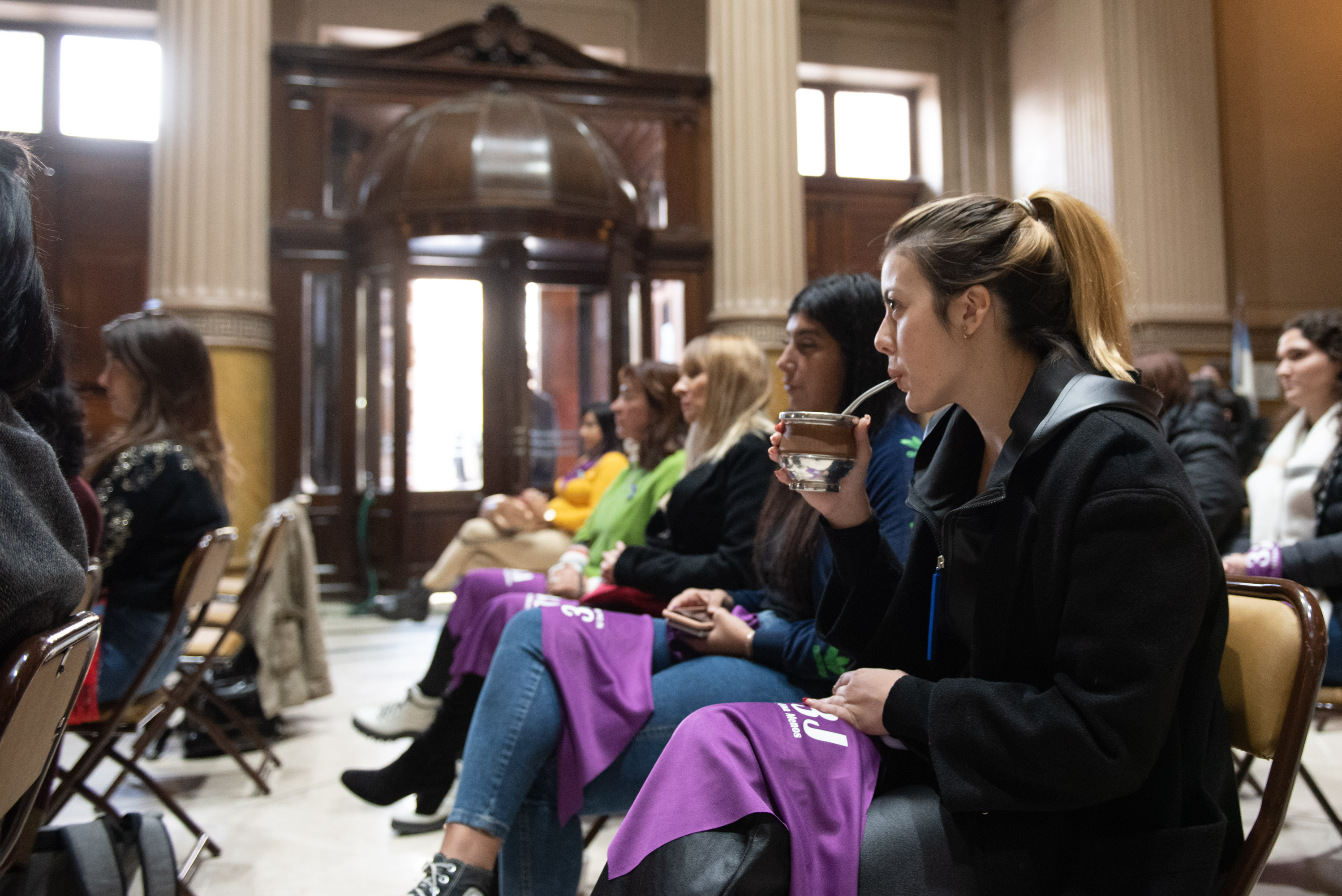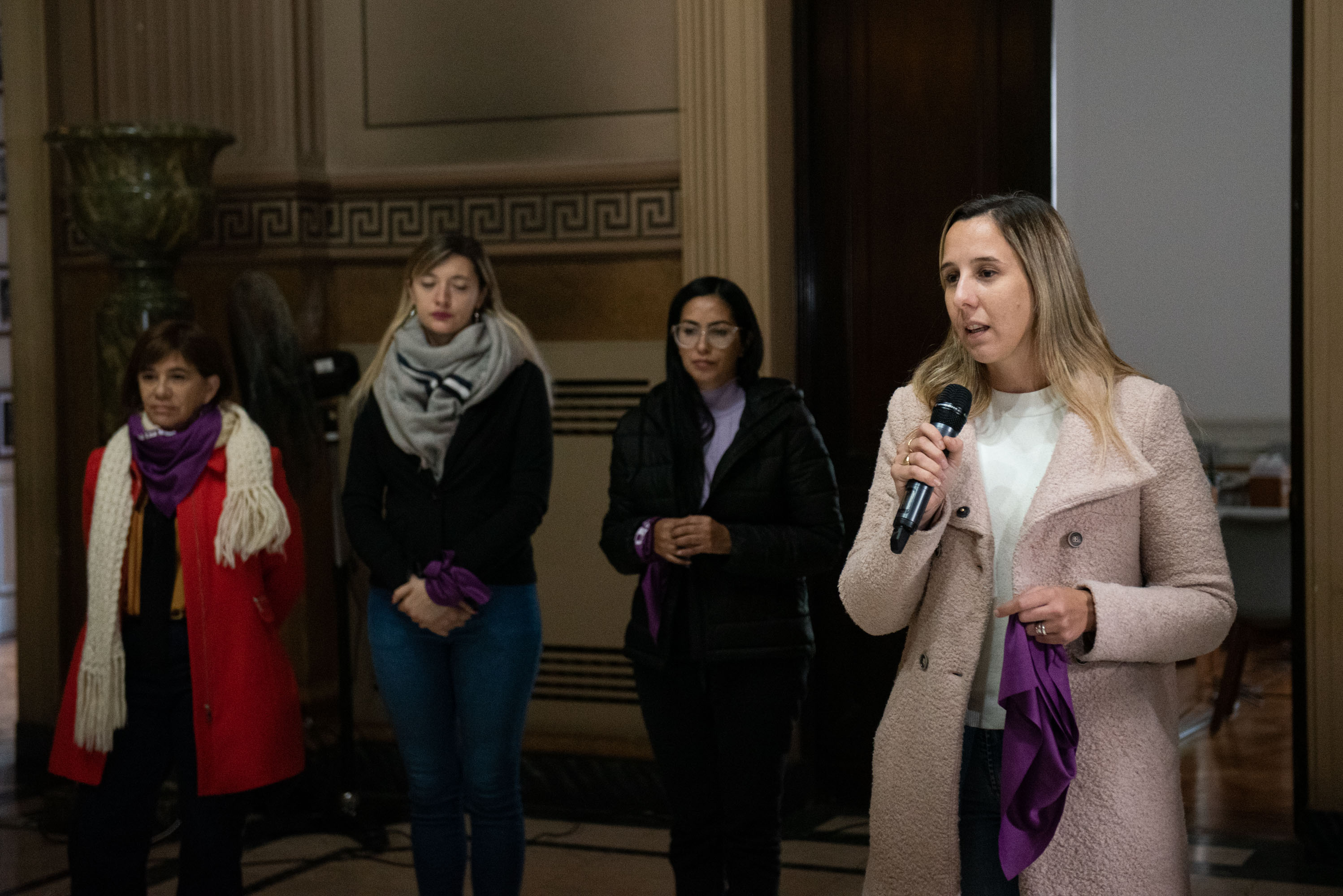 Estuvieron presentes las diputadas Lucía Iañez y Lucía Klug; la directora de Relaciones con la Comunidad para el Abordaje de las Violencias de la HCD, Claudia Carpintero; y la directora de Equidad de Género y Diversidad Sexual de la HCD, Mariela Breard; quienes realizaron una jornada de reflexión y un pañuelazo junto con trabajadoras de la Cámara de Diputados.