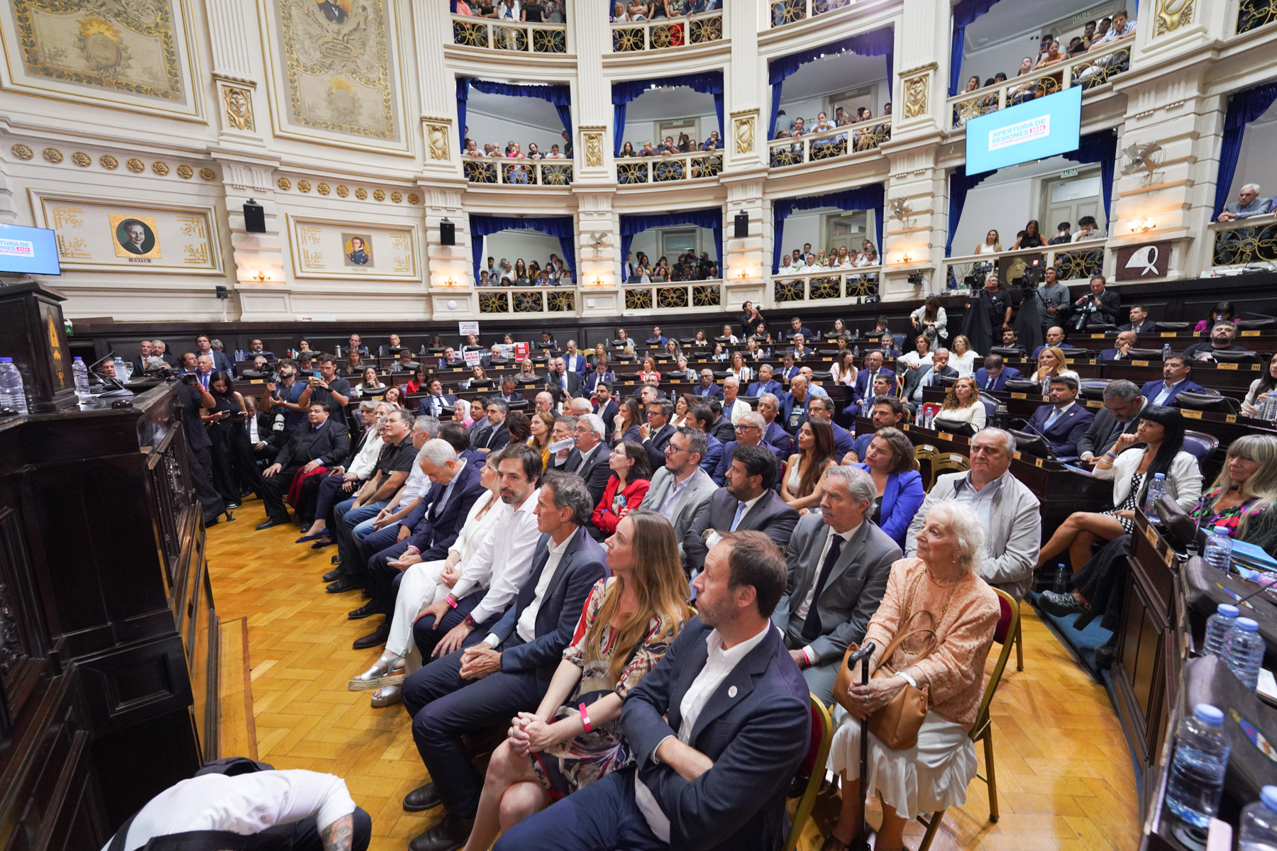 El mensaje del mandatario, que se dirigió "al pueblo de la Provincia", lo presenció además del cuerpo de diputados y de senadores, la Presidenta de la Suprema Corte de Justicia de la provincia, Hilda Kogan; el ex gobernador Felipe Solá; el intendente de la ciudad capital, Julio Alak; funcionarios de los tres poderes del Estado provincial y Madres y Abuelas de Plaza de Mayo, entre otras personalidades.